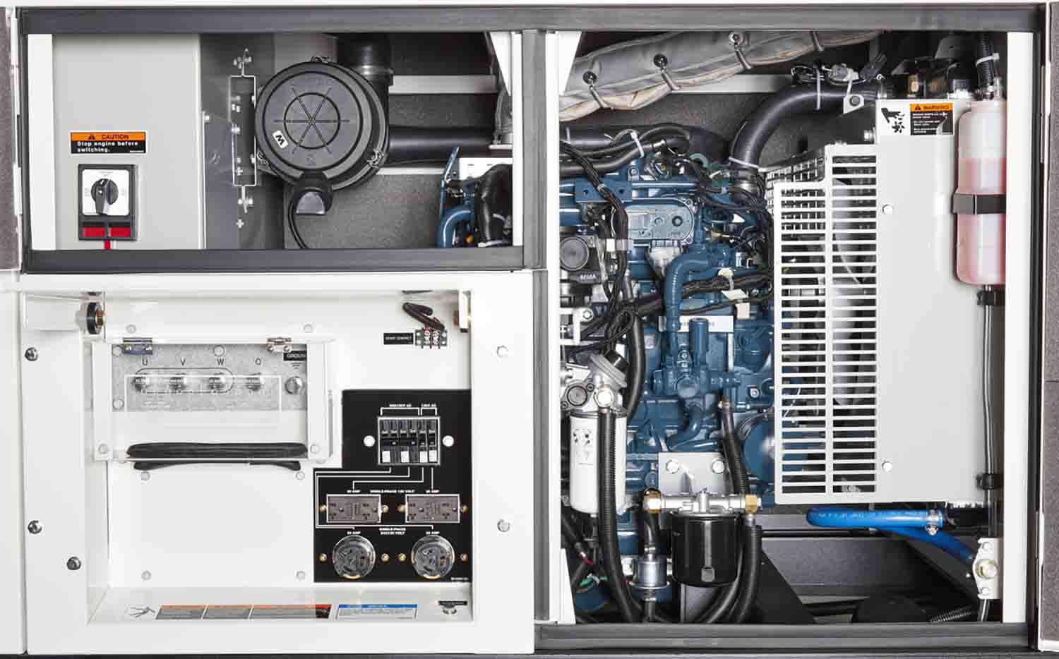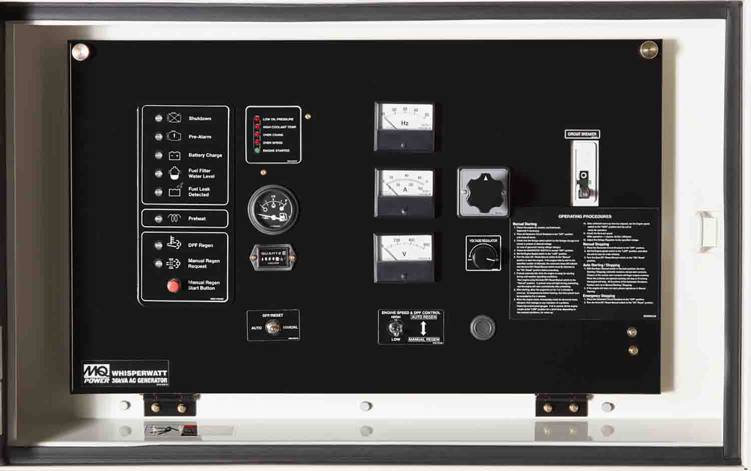 It features an auto start stop that allows the generator to start from a remote location. The unit features a powder-coated, weatherproof steel housing that allows a substantially low operating noise level of 63 dB(A). A comprehensive analog control panel provides instrumentation including AC ammeter, AC voltmeter, frequency meter, AC circuit breaker, engine gauges and much more.